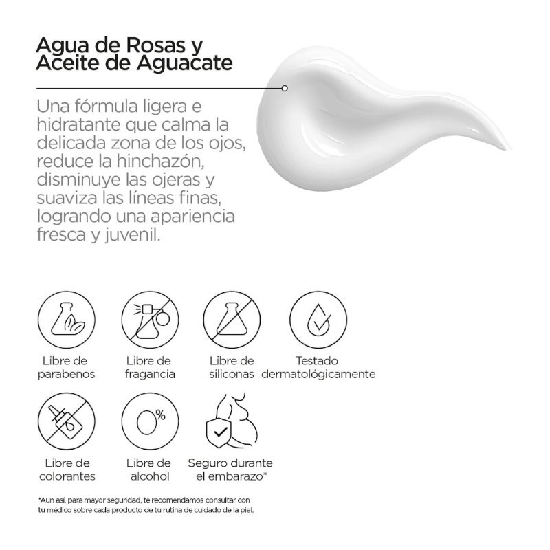 Rose water provides a calming and refreshing effect, while avocado oil helps nourish and soften the skin, improving its elasticity. With continued use, the eye contour area appears more hydrated, supple, and radiant.