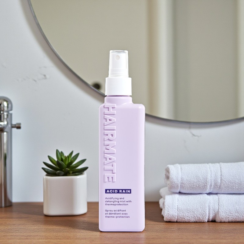 Hairmate Acid Rain es una bruma desenredante acidificante con pH 4 que aporta brillo, suavidad y protección térmica. Enriquecida con queratina, aceite de grosella y nuez de Brasil, deja el cabello más manejable desde el primer spray.