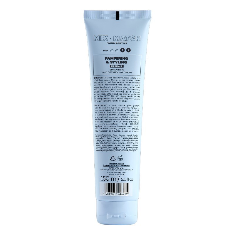 Hairmate Mermaid Universal Cream es una crema desenredante todo en uno que hidrata, suaviza y protege el cabello al instante gracias a su fórmula con manteca de moringa, aceite de nuez de Brasil y queratina vegana.