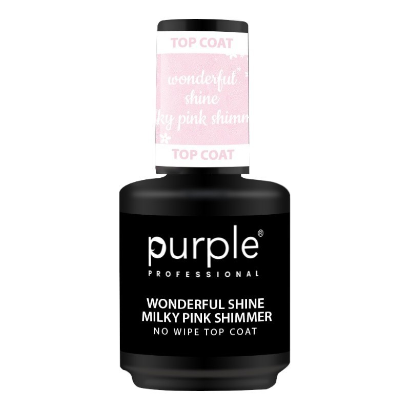 El Top Coat Wonderful Shine Milky Pink Shimmer 15ml de Purple Professional combina lo mejor de dos mundos: un suave tono rosa lechoso que embellece la uña y un delicado efecto shimmer que aporta luz y dimensión sin recargar el diseño.