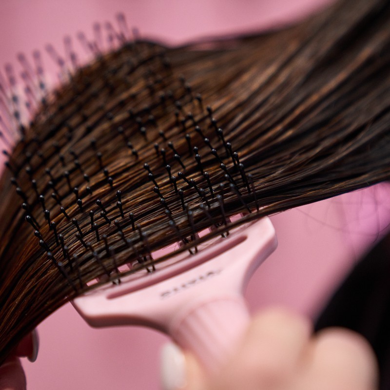 Utiliza el cepillo sobre el cabello mojado o húmedo, comenzando por las puntas y subiendo poco a poco hacia la raíz. Desenreda con movimientos suaves. También puede usarse en seco para definir ondas o rizos y controlar el encrespamiento.
