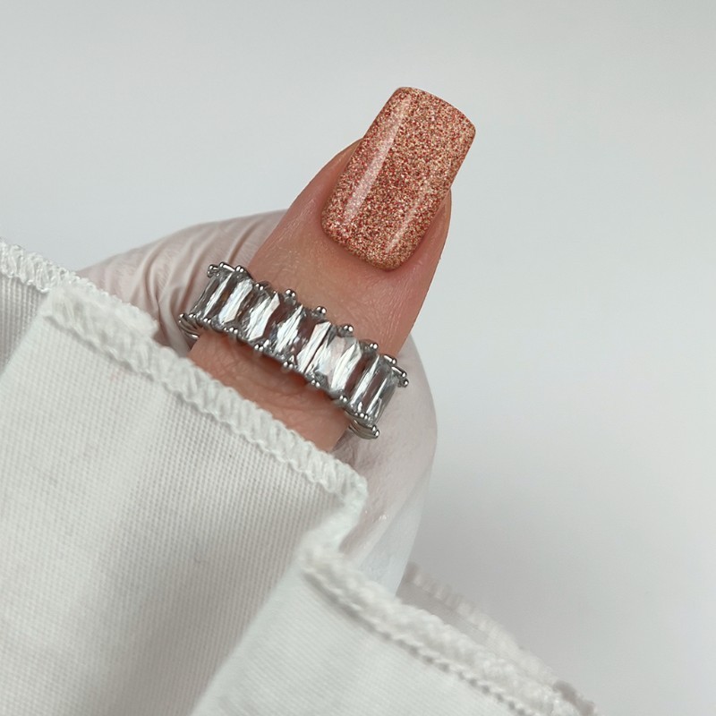Si se utiliza Elastic Base, aplicar una capa fina, curar, después una segunda capa más generosa, dar forma, curar, limpiar la goma, limar y retirar el polvo. - Aplicar una capa fina de Devotion Glitter y curar en lámpara LED/UV durante 60/120 segundos. Repetir el proceso con una segunda capa.