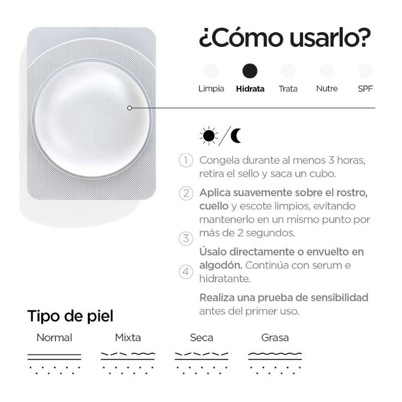 Congelar el cubo previamente. Retirar del envase y masajear suavemente sobre la piel limpia del rostro y cuello, evitando el contorno de ojos. Aplicar con movimientos circulares hasta su completa absorción o durante unos minutos según la tolerancia al frío.