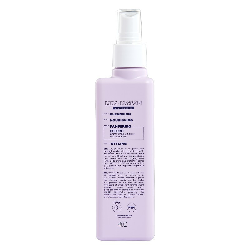 Hairmate Acid Rain è uno spray districante acidificante con pH 4 che dona lucentezza, morbidezza e protezione dal calore. Arricchito con cheratina , olio di ribes nero e olio di noce brasiliana , rende i capelli più gestibili fin dalla prima applicazione.