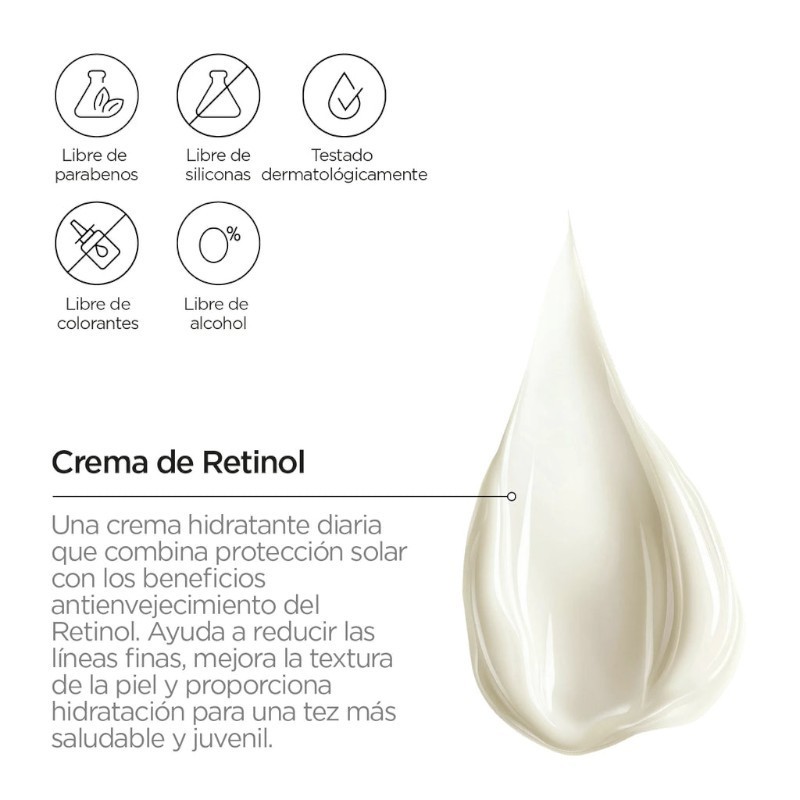 La sua formula è pensata per l'uso quotidiano , donando idratazione, morbidezza e un progressivo miglioramento della texture e dell'aspetto della pelle. Il retinolo contribuisce a un incarnato più uniforme e rivitalizzato, mentre il filtro solare aiuta a proteggere dai danni dei raggi UV.