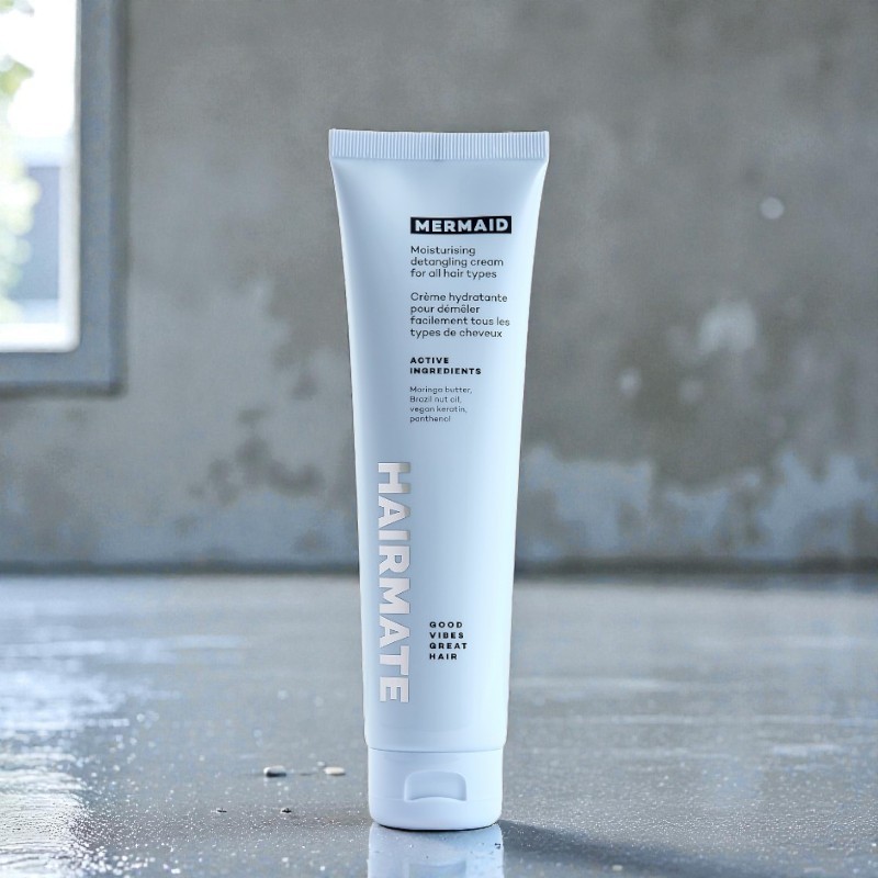 O creme desembaraçante universal Hairmate Mermaid é um produto multifuncional que hidrata, suaviza e protege instantaneamente os cabelos, graças à sua fórmula com manteiga de moringa, óleo de castanha-do-pará e queratina vegana.