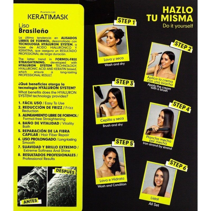 Diferentemente de outros tratamentos mais antigos, este sistema é formulado sem formaldeído , o que facilita a aplicação e o torna adequado para realizar o tratamento em casa, seguindo corretamente as instruções.