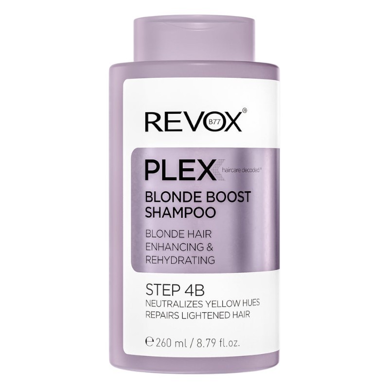Dentro do sistema Revox Plex , este shampoo combina os benefícios de uma limpeza eficaz com ingredientes que cuidam de cabelos coloridos ou descoloridos. O Shampoo Blonde Boost ajuda a manter os tons loiros, prevenindo o aspecto opaco ou tons amarelados indesejados, além de auxiliar na reconstrução das fibras capilares danificadas.